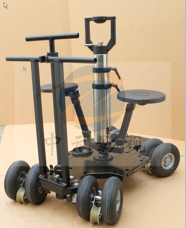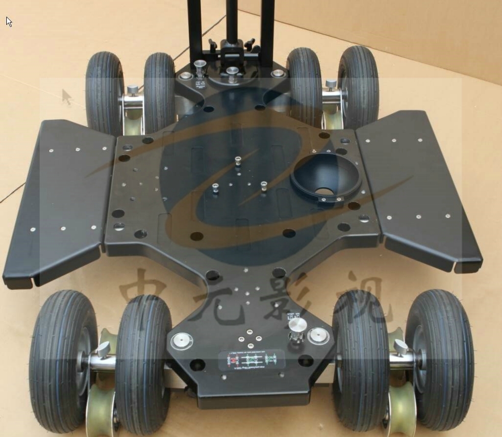 DBC-Ⅰ型多功能摄像轨道车是我公司在2012年开发的一款高端多用途轨道移动拍摄辅助设备。该产品在国际同类产品的基础上,不断改进完善,造型优美,性能卓越,整套产品人性化设计,模块化组合。车体采用高强度低比重的航空镁铝合金,转向机构采用四轴联动和两轴联动机构并行设计,行进拍摄中转向灵活自如,可根据现场需要,随时调整前后轮系的转向机构,不仅可以沿直线行走,而且可以做到前轮系转向后轮系不动、后轮系转向前轮系不动、前后轮系同时联动等复杂拍摄功能需求,还可以使车体绕拍摄目标画圆旋转拍摄,完成特殊拍摄需求。车体采用四组气轮与轨道轮并行运行模式,上轨道时无需拆卸更换,轨道轮采用进口聚氨酯材料,减震消噪性能良好,固定方式采用180°旋转锁紧设计,操作简单,方便快捷。该产品配备三级气压无级升降立柱,机位高低随意调整。同时配置2块车体加宽插板,4块加高踏板,可根据现场需求自由安装组合,满足不同场景拍摄需求。该产品安装方便快捷,拍摄画面平稳流畅,是高端影视工作组的首选。